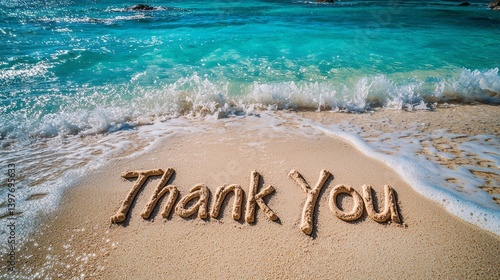 © Gulnaz, Fototapeta premium A beach with the words "thank you" written in the sand