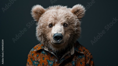 Fototapeta premium A bear is wearing a shirt and standing in front of a wall