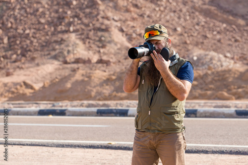 © Mountains Hunter, Obraz premium A bearded man on the mountain of Moses with a camera, pilgrimage to the holy places. Nature photographer taking photos in the mountains.