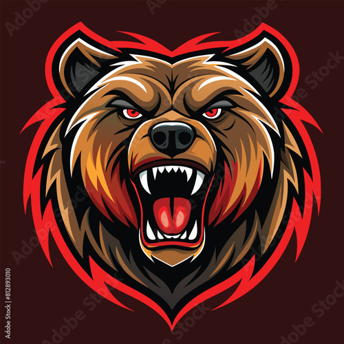 Fototapeta premium A bears head with fierce red eyes and sharp fangs, Intense Angry Bear Head Logo, Striking Illustration