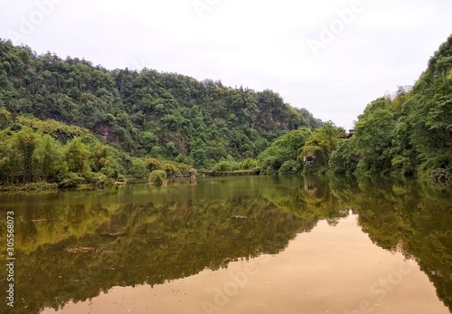 © salah, Fototapeta premium a beatiful lake with green trees and reflection in the water