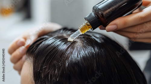 © mahamad, Fototapeta premium A beautician applying hair growth serum to a client's scalp for a healthy hair treatment.