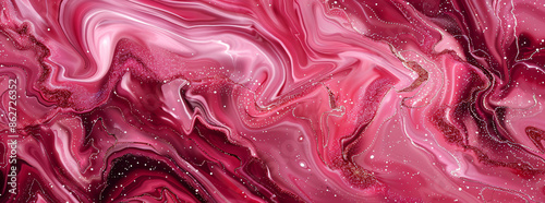 © Welle Photos, Obraz premium A beautiful abstract background of pink and red marble texture with glittery swirling patterns and splashes of color. It is a beautiful pattern of marble and glitter.