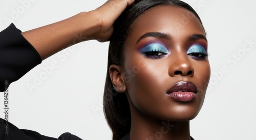 © Ayahe Stock, Fototapeta premium A beautiful afro woman with flawless skin and elegant makeup, silver blue eyeshadow smiling in a close-up studio portrait