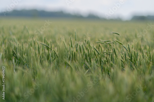 Obraz premium A Beautiful and Lush Green Field of Ripening Wheat Spreading Under a Clear...