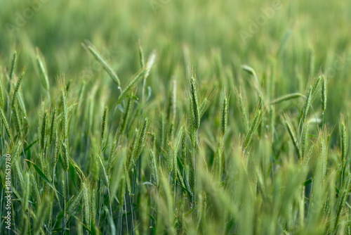 Fototapeta premium A Beautiful and Lush Green Wheat Field Extending Out Beneath a Clear and...