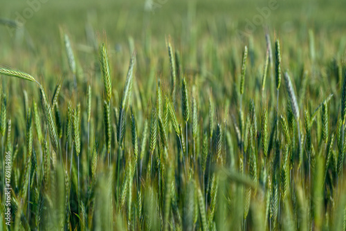 Obraz premium A Beautiful and Lush Green Wheat Field Stretching Under a Bright and Clear...