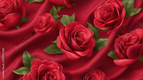 Fototapeta premium A beautiful and romantic arrangement featu vibrant red roses scattered across a luxurious, draped, deep red satin fabric creating a captivating and elegant scene.