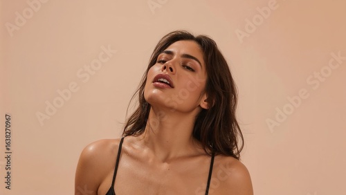 © K4VEE, Fototapeta premium A beautiful and sensual portrait of a woman with her head tilted back in pleasure or relaxation. A concept for skincare, wellness, and sensory experience