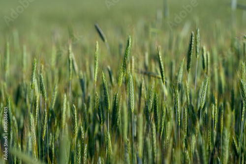 Obraz premium A Beautiful and Vibrant Green Wheat Field Bathed in Bright Sunlight on a...