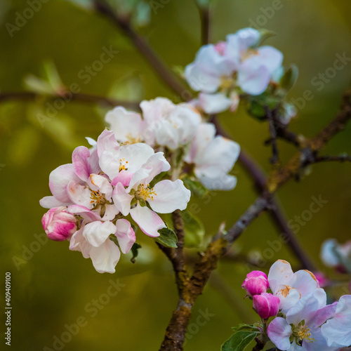 © dachux21, Fototapeta premium A beautiful apple tree flowers on the branches of an old tree. Spring sceney of abandoned orchards. Flowering fruit tree in the Northern Europe.