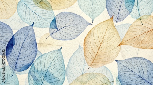 © Espresso, Obraz premium A beautiful arrangement of delicate, transparent leaves in shades of blue, yellow, and brown, creating a serene atmosphere.