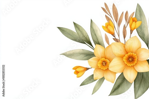 Fototapeta premium A beautiful arrangement of yellow flowers and green leaves, perfect for spring decorations and floral-themed designs.