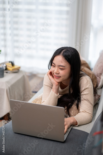 Naklejka premium A beautiful Asian woman is using her laptop, watching a movie while lying on a sofa.