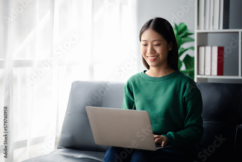 Naklejka premium A beautiful Asian woman sits on the sofa in the living room, she is using her laptop to play social media and chat with friends online. The concept of using technology to communicate on the Internet.