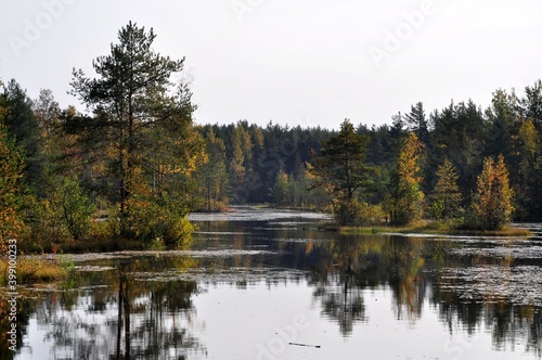 Fototapeta premium A beautiful autumn lake with mirror water. Trees with red yellow leaves.