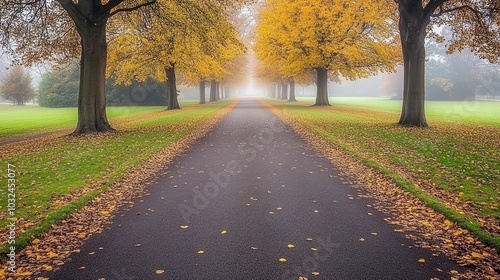 © Pricha.RT, Naklejka premium A beautiful autumn scene with elegant golden leaves falling on an ethereal, foggy backdrop, capturing the essence of fall.