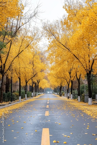 Fototapeta premium A Beautiful Autumn Scene with Yellow Ginkgo Trees Lining a Quiet Street,...