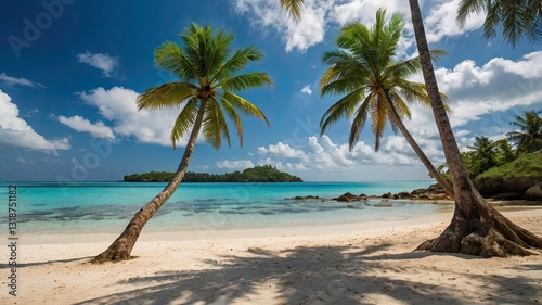 © SUNSU, Fototapeta premium A beautiful beach with palm trees and a clear blue ocean