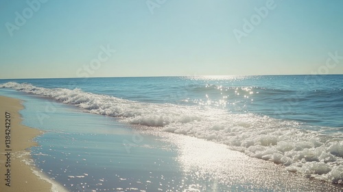 © ida, Fototapeta premium A beautiful beach with waves and shimmering sunlight is visible