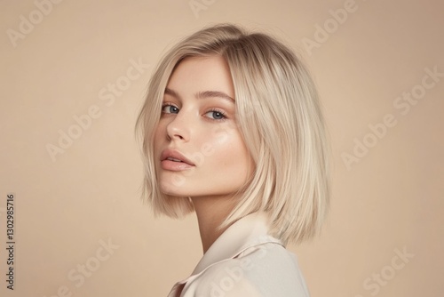 © Jannik, Fototapeta premium a beautiful blonde woman with a wavy bob haircut, set against a beige background