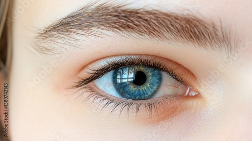 © Pricha.RT, Obraz premium A beautiful blue eye with striking depth, natural lighting, and a perfectly centered black pupil.