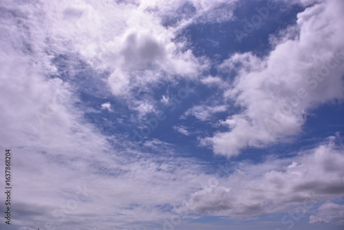 Fototapeta premium A beautiful blue sky filled with fluffy white cumulus and wispy cirrus clouds on a bright sunny day.
