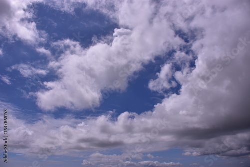 Fototapeta premium A beautiful blue sky filled with fluffy white cumulus and wispy cirrus clouds on a bright sunny day.