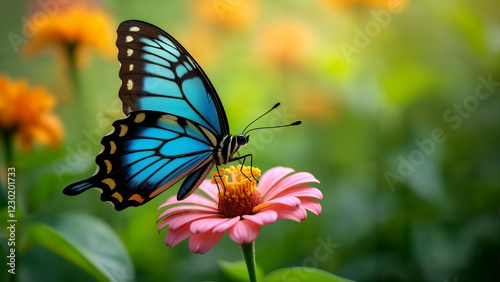 Fototapeta premium A Beautiful Blue Tiger Butterfly Showcasing Its Colors in a Lush Garden Setting