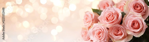 © Tondone, Obraz premium A beautiful bouquet of pink roses against a softly blurred background with shimmering lights. Ideal for romantic themes, celebrations, and floral arrangements.