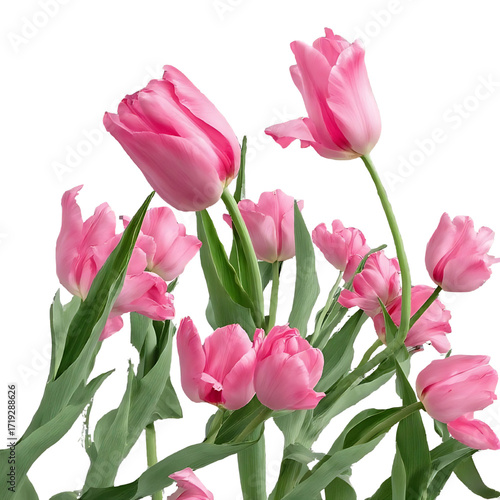 © VIJAY, Fototapeta premium A beautiful bouquet of pink tulips and flowers with green leaf isolated on a white background for spring beauty.