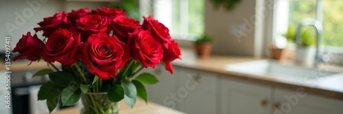 © Pawarit, Obraz premium A beautiful bouquet of vibrant red roses in a bright kitchen setting.