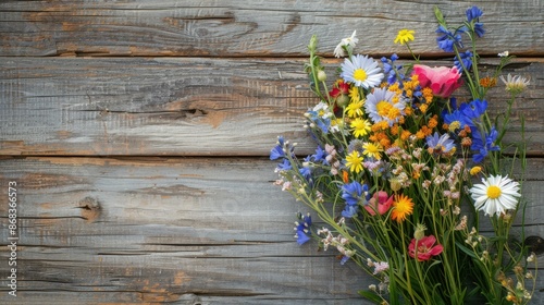 Fototapeta premium A beautiful bouquet of wildflowers against a rustic wooden background, showcasing vibrant colors and natural beauty.