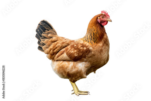 © darshika, Fototapeta premium A beautiful brown domestic hen with a red comb and wattle, standing gracefully, isolated against a solid transparent background. background removed