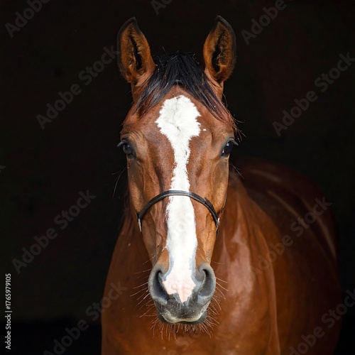 © Lintang, Obraz premium A beautiful brown horse facing forward against a dark background