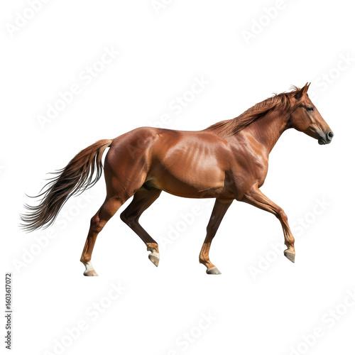 © Wahyu, Obraz premium A beautiful brown horse gracefully trots across the frame, its muscular body and flowing tail highlighted. Ideal for equestrian themes, nature, or animal related designs.