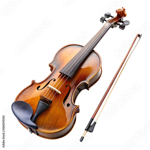 © JUNAKY, Fototapeta premium A beautiful brown varnished violin with a bow, isolated on a transparent background, a classic string musical instrument for performance and practice