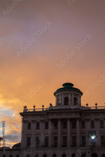 © Вика Огнева, Obraz premium A beautiful building on the background of a colorful sunset
