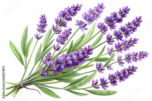 Fototapeta premium A beautiful bunch of purple lavender flowers with green leaves, isolated on...