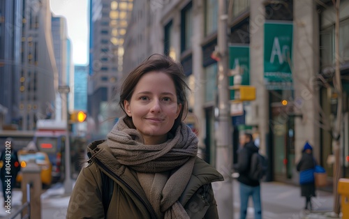 Fototapeta premium A beautiful businesswoman stands on the street of financial district, smiling at the camera, wearing a warm jacket and scarf. atmosphere of busy city life. lively urban vibe. generative AI