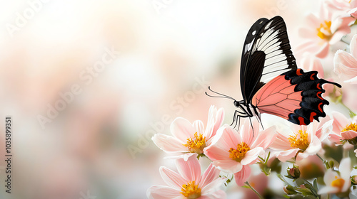 © Jiraphat.N, Fototapeta premium A beautiful butterfly perched on delicate pink flowers in a serene natural setting