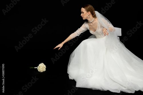 © Georgi, Naklejka premium A beautiful charming girl, the bride in a luxurious and elegant white wedding dress, reaching their hand to a graceful bouquet of white roses lying next to her. Isolated on a black background.