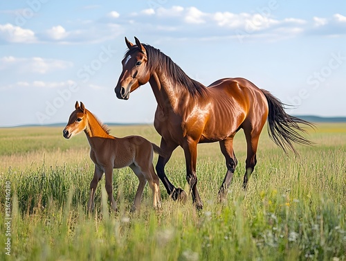 Fototapeta premium A beautiful chestnut mare and her newborn foal gently stroll across a vibrant green pasture under a bright summer sky.
