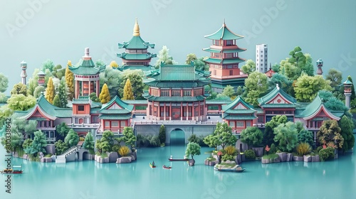 Fototapeta premium A beautiful Chinese style city with a lake and many traditional buildings. The water is green and the trees are lush. The city is peaceful and serene.