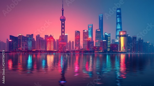 © Ardhana, Fototapeta premium A beautiful cityscape illuminated brightly at night with reflections