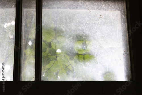 Naklejka premium A beautiful closeup of a dirty window glass with bush leaves. Abandoned...