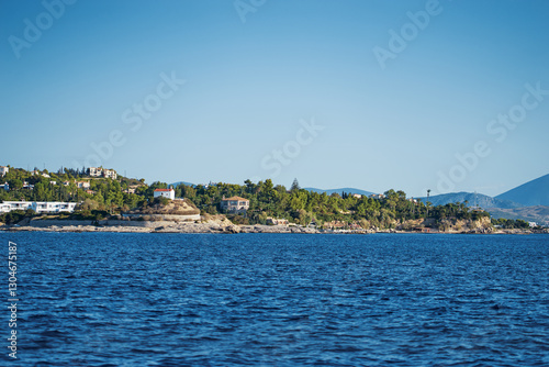 Naklejka premium A beautiful coastal view of Greece island showcasing vibrant blue waters, lush greenery, and idyllic residential areas under a clear blue sky, conveying serenity and natural beauty.