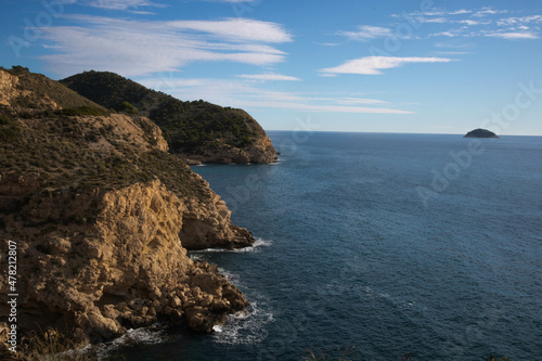 © sandra, Fototapeta premium a beautiful coastline, beach, coves and cliffs in Villajoyosa, Alicante, Spain. Walking for the mountain route.