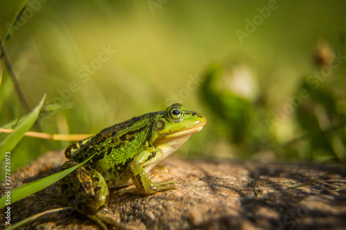 Fototapeta premium A beautiful common green water frog enjoying sunbathing in a natural habitat...