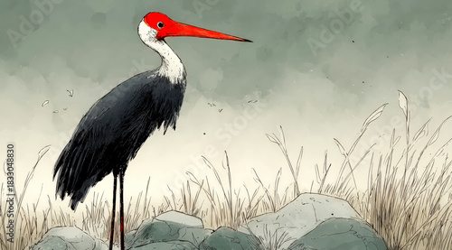 © fanjianhua, Naklejka premium A beautiful crane standing in a natural grassy area